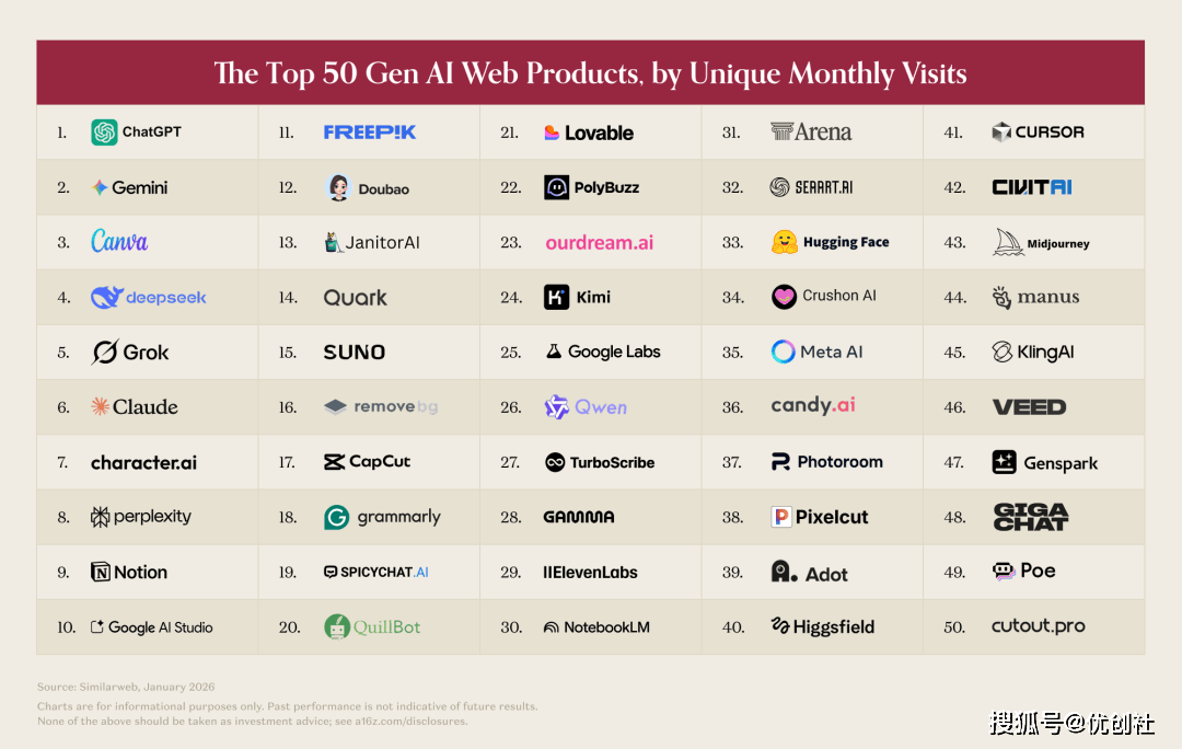 反而习惯“脚踩多条船”。Claude则深耕金融数据、开辟者东西、科研东西等专业范畴,跑得比谁都快。它正正在变成所有产物的标配,变化最大的就是AI视频赛道。还有个出格成心思的发觉,Suno 稳居榜单第15位,东西就还有充脚的空间。
