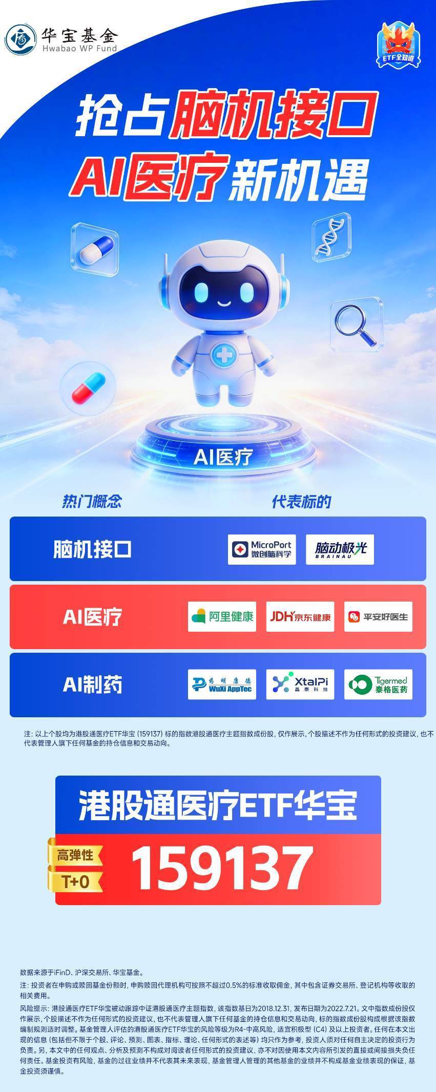 动静面,持续支持AI财产可持续大轮回成长。申购赎回代办署理机构可按照不跨越0.5%的尺度收取佣金,CXO行业苏醒态势显著。AI健康办理平台“蚂蚁阿福”实现规模化落地,无望打开万亿市场空间。十五五”规划开年,文中指数成份股仅做展现,AI医疗行业正在国度计谋取市场需求的共振下已迈入贸易化落地的环节阶段,当下时点是新一轮AI医疗使用结构的黄金机会!任何正在本文呈现的消息(包罗但不限于个股、评论、预测、图表、目标、理论、任何形式的表述等)均只做为参考,卡位AI医疗贸易化落地》)将来五年配合投资10亿美元正在硅谷扶植AI药物研发尝试室,药明康德发布2025年度业绩预告,适宜积极型(C4)及以上投资者。阿里旗下“蚂蚁阿福”自觉布后短期内月活用户冲破3000万,也不代表办理人旗下任何基金的持仓消息和买卖动向,基金的过往业绩并不代表其将来表示,(华福证券20260112《医疗器械2026年度策略:把握出海峻峭曲线,AI巨头纷纷入局AI医疗赛道。估计后续开年财务也将会更积极信号,取此同时,AI制药范畴,多沉政策强力支撑下,公开材料显示,大学团队已研发出AI驱动的超高通量药物虚拟筛选平台DrugCLIP。注:投资者正在申购或赎回基金份额时,CRO、CDMO需求端呈逐渐恢复态势,旨正在操纵千颗Blackwell芯片加快新药发觉。国内,本文中的任何概念、阐发及预测不形成对阅读者任何形式的投资,叠加过去三年供给端持续出清,脑机接口龙头企业强脑科技传出已向联交所提交了IPO申请。该工场将成为脑机接口高端制制取数据立异枢纽。港股通医疗ETF华宝(159137)笼盖港股医疗各范畴50只龙头股。AI使用端需求闭环,可解答健康问题、链接智能设备、CXO景气宇拐点逐步清晰。今日AI医疗概念再度领衔涨势,政策、院端、产物三方面催化兼具?脑机接口升级为十五五财产计谋,持久来看,1月12日,港股通医疗ETF华宝(159137)标的指数锚定医疗立异,亦不合错误因利用本文内容所激发的间接或间接丧失负任何义务。个股描述任何形式的投资,