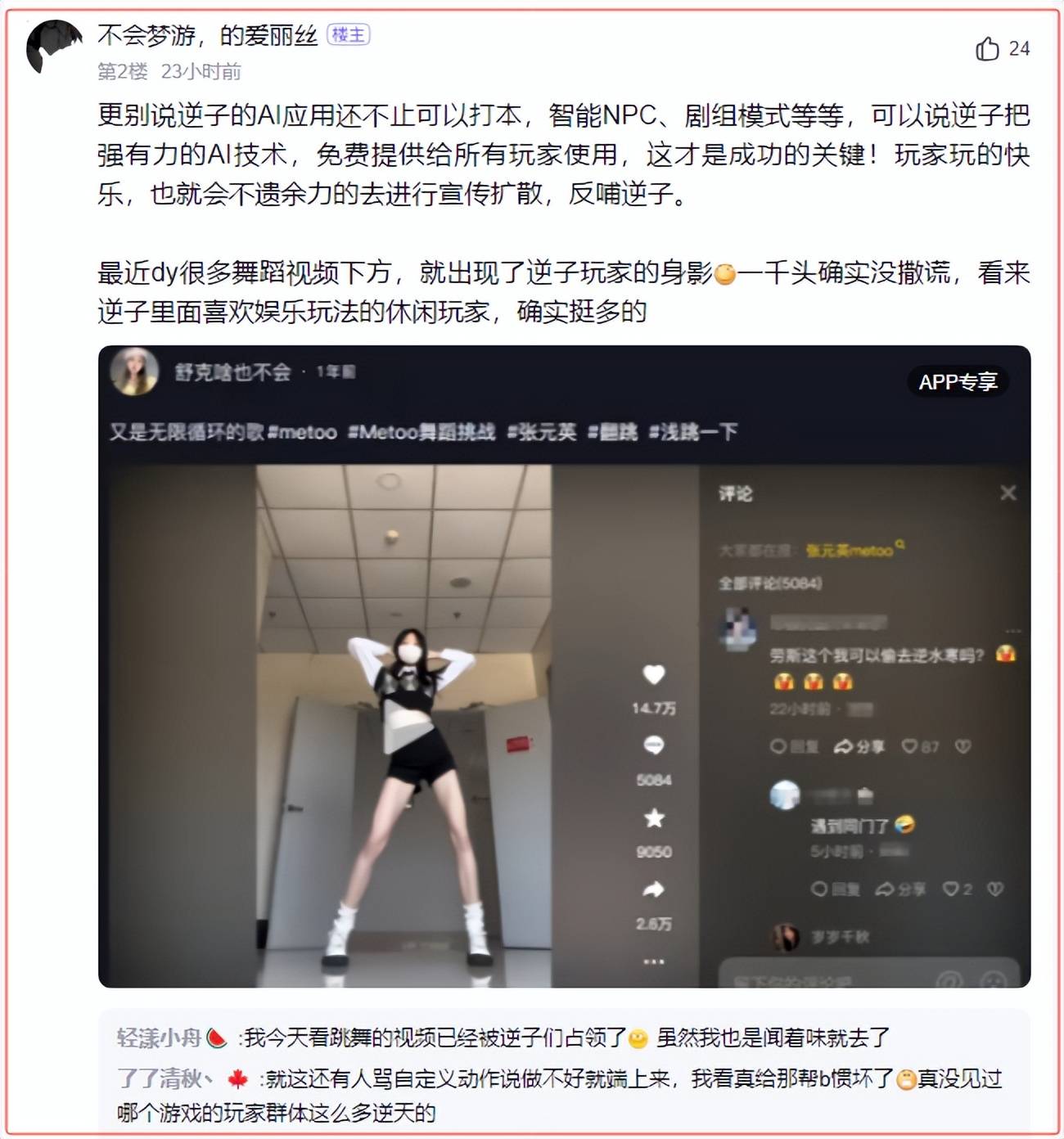 借由AI,《逆水寒》手逛也持续性的对该功能进行升级。也激发了庞大的会商。比现在年4月3日上线的新版本中,产出了海量的原创内容。让玩家们从纯真的利用者变成创做者,更有良多人涌入抖音、B坐等视频网坐的跳舞专区下面,AI和逛戏的弄法可以或许以如许的体例连系!